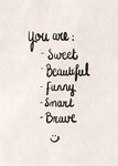 Lieve denken aan kaart met de tekst: You are: Sweet, beautiful, funny, smart, brave.