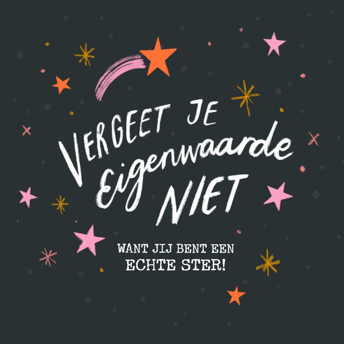 Laat weten dat je aan iemand denkt met deze leuke denken aan kaart. Op de kaart staat: Vergeet je eigenwaarde niet. Want jij bent een echte ster!
