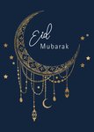 Op deze mooie Eid Mubarak kaart staat een grote versierde gouden maan, versierd met allerlei gouden details.