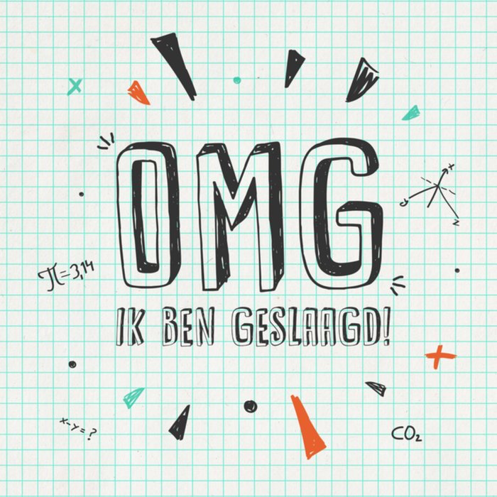 Grappige uitnodiging van Greetz, met ruitjespapier op de achtergrond. Op de voorkant staat OMG, ik ben geslaagd.