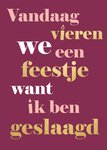 Een subtiele maar erg leuke kaart om iedereen uit te nodigen voor jouw examenfeest. De kaart is donkerrood en er staat op geschreven: 'Vandaag vieren we een feestje want ik ben geslaagd'.