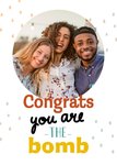 Vrolijke felicitatiekaart met gekleurde letters en de tekst: Congrats you are the bomb. Voeg je eigen foto toe.