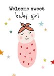 Schattige geboorte kaart met daarop een getekende baby met verschillende kleuren sterren en de tekst: Welcome sweet baby girl.