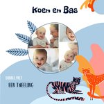 Schattige geboorte kaart met twee tijgertjes op de kaart en de tekst: Dubbel pret een tweeling. De namen op de kaart zijn aanpasbaar en je kunt een eigen foto toevoegen.