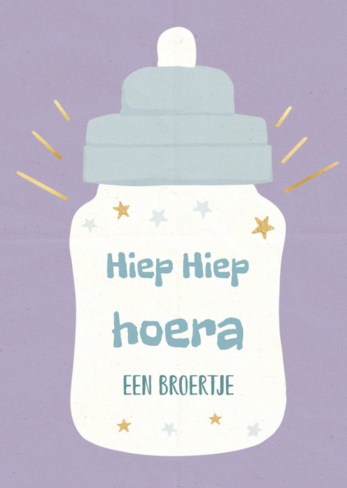 Lieve kaart met daarop een flesje, gouden en blauwe sterren en de tekst: Hiep Hiep Hoera een broertje.