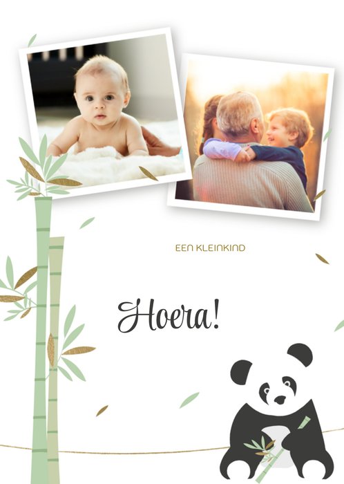 Lieve kaart met daarop een schattige panda en de tekst: Een kleinkind. Hoera! Voeg twee leuke eigen foto's toe.