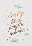 Verras met dit schattige geboortekaart met de tekst "Een lief klein jongetje geboren." De kaart is niet aanpasbaar.