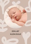 Schattige geboorte kaart met daarop getekende plantjes en de tekst: Een lief klein zusje. Je kunt een eigen foto toevoegen.
