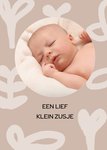 Schattige geboorte kaart met daarop getekende plantjes en de tekst: Een lief klein zusje. Je kunt een eigen foto toevoegen.