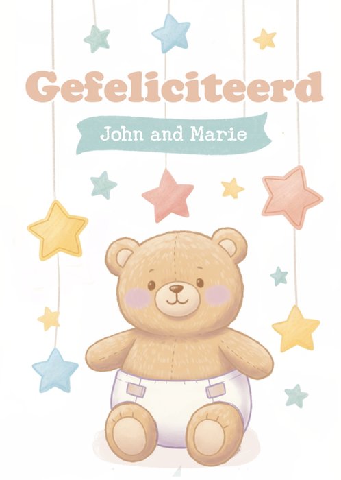 Verras met deze zoete Geboortekaart met de tekst: 'Gefeliciteerd'. De namen zijn aanpasbaar.