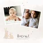 Schattige geboorte kaart met daarop twee konijntjes en de tekst: Hoera! Emma, je bent nu een grote zus. Je kunt twee eigen foto's toevoegen en de naam is aanpasbaar.