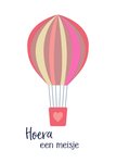 Op deze schattige geboortekaart staat een luchtballon met de tekst: 'Hoera, een meisje.'