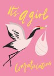 Lieve geboortekaart met een ooievaar en de tekst: It's a girl congratulations.