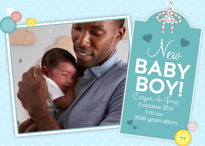Er is een lieve baby geboren! Feliciteer met dit leuke geboortekaartje van Greetz! Op de kaart kun je een foto zetten en er staat de tekst: New baby boy!