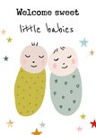 Schattige geboorte kaart met twee babies op de kaart met verschillende kleuren sterrren en de tekst: Welcome sweet little babies.