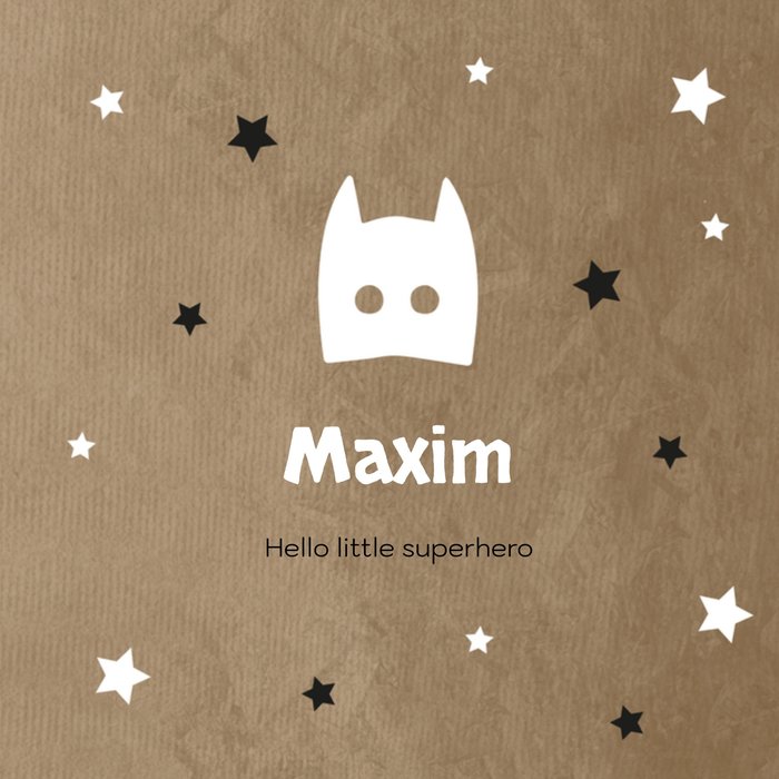 Op deze lieve geboortekaart met aanpasbare naam staat: 'Hello little superhero'.