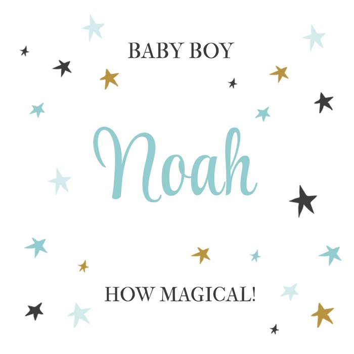 Vrolijk geboortekaartje met sterren en de tekst: Baby boy [naam] how magical!