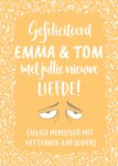 Geboortekaart met aanpasbare naam en de tekst: Gefeliciteerd [namen] met jullie nieuwe liefde! (alvast medeleven met het gebrek aan slapen)