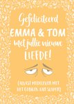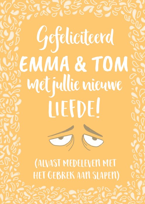 Geboortekaart met aanpasbare naam en de tekst: Gefeliciteerd [namen] met jullie nieuwe liefde! (alvast medeleven met het gebrek aan slapen)