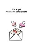 Leuke geboortekaart met illustratie en de tekst: It's a girl! Van harte gefeliciteerd