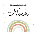 Lieve kaart met daarop een regenboog en sterren met de tekst: Welcome little miracle. Je kunt de naam aanpassen.