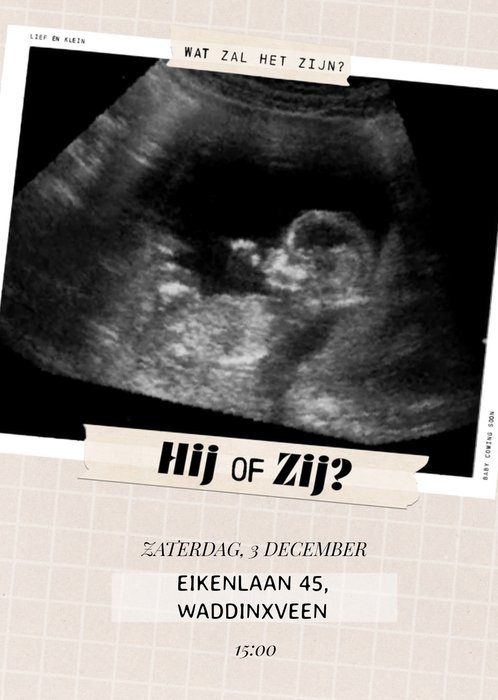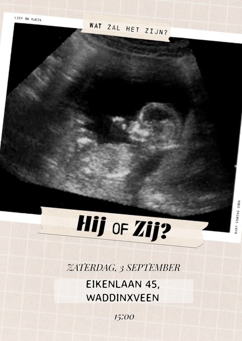Uitnodiging voor een feestje waar het geslacht van de baby bekend wordt gemaakt. De uitnodiging is grijs en op de voorkant kan een eigen foto, datum, tijd, adres en naam worden toegevoegd.