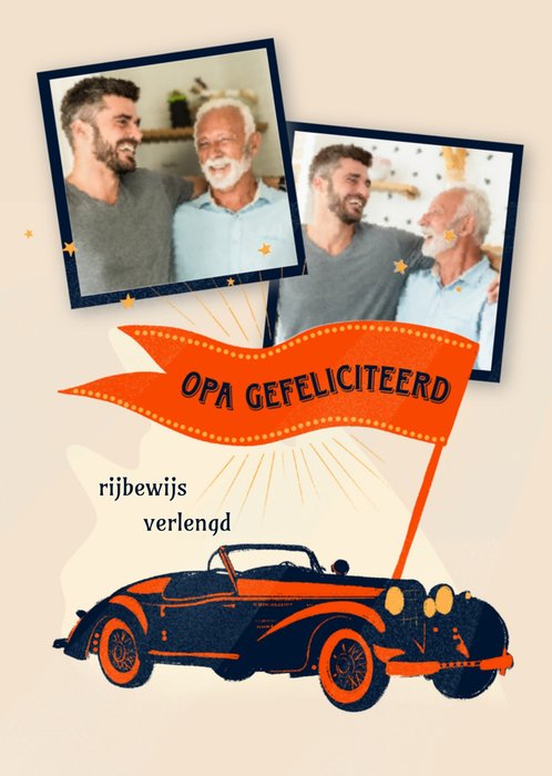 Is jouw opa op zijn oude dag nog geslaagd? Stuur hem een leuke kaart met een auto om hem te feliciteren. Op deze kaart staat: Opa gefeliciteerd. Rijbewijs verlengd. Ook kun je twee foto's toevoegen.