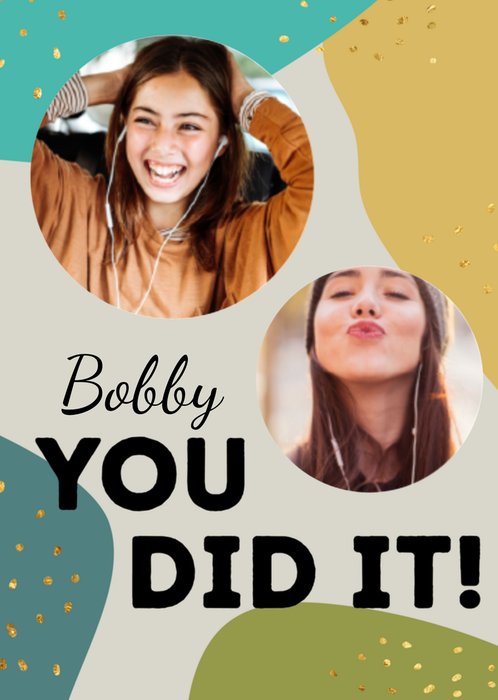 Iemand die geslaagd of afgestudeerd is? Stuur haar dan deze abstracte en kleurrijke kaart van Greetz. Op de kaart staat: You did it! Ook kun je een naam toevoegen en twee foto's.