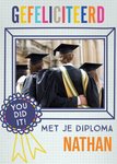 Wauw! Eindelijk afgestudeerd. Stuur deze kaart om te feliciteren. Op de kaart staat: Gefeliciteerd met je diploma [naam].