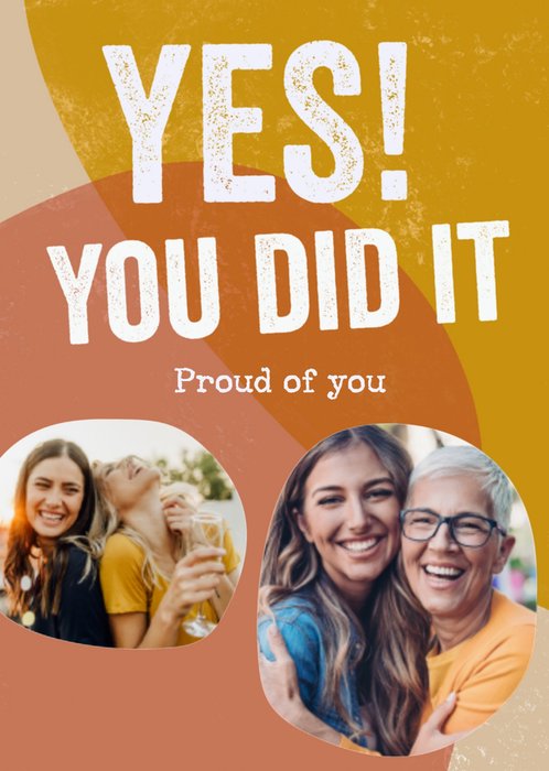 Wat leuk dat je dochter geslaagd is! Stuur haar als felicitatie deze leuke geslaagdkaart! Op de kaart staat: Yes! You did it. Prouod of you. Je kunt twee fotó's toevoegen.