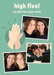 Wat zullen jullie trots zijn! Jullie zoon is geslaagd! Stuur hem daarom een leuke kaart met illustraties van Greetz! Op deze kaart staat: High five! We zijn trots op je, zoon! Ook kun je twee foto's toevoegen.