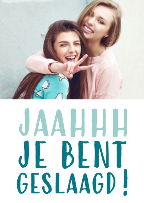 Natuurlijk ben je super blij als je geslaagd bent voor je examens. Van deze fotokaart word je extra blij. Naast de foto staat de tekst: "Jaaaaaah je bent geslaagd!"