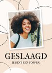 Een leuke geslaagdkaart waar je een foto aan kunt toevoegen en waar de tekst: Geslaagd je bent een topper, op staat.