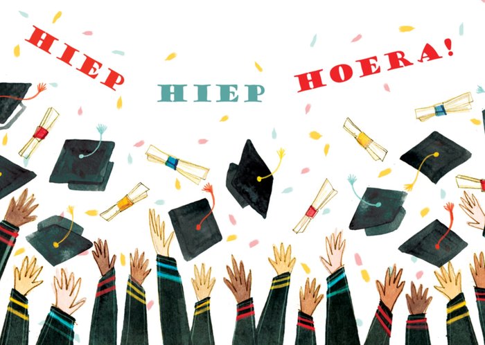 Geslaagdkaart met illustratie en de tekst: Hiep hiep hoera!