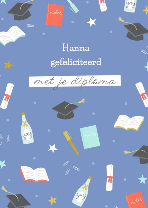Leuke geslaagdkaart met illustraties en aanpasbare naam.