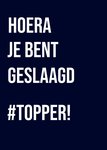 Is er een #topper geslaagd? Feliciteer hem of haar met het behaalde diploma! Op de zwarte voorkant van de kaart staat in witte letters: "Hoera je bent geslaagd #topper!"