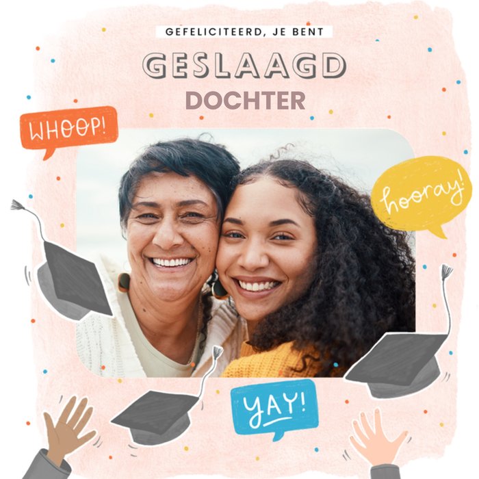 Verras met deze vrolijke geslaagdkaart. De tekst en foto zijn aanpasbaar.