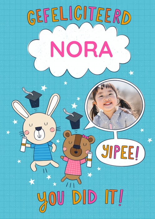 Verras met deze vrolijke geslaagdkaart. De tekst en foto zijn aanpasbaar.