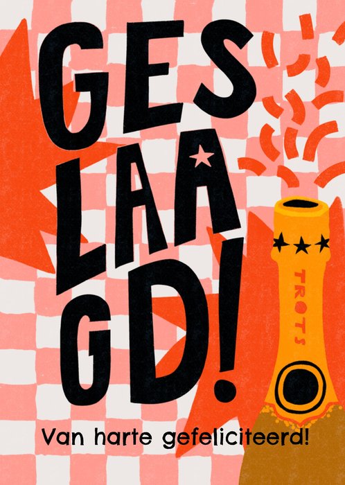 Kleurrijke geslaagdkaart met fles bubbels, aanpasbare tekst, en de tekst: 'Geslaagd! Officieel afgestudeerd.' Verras iemand met deze geïllustreerde geslaagdkaart van Greetz.