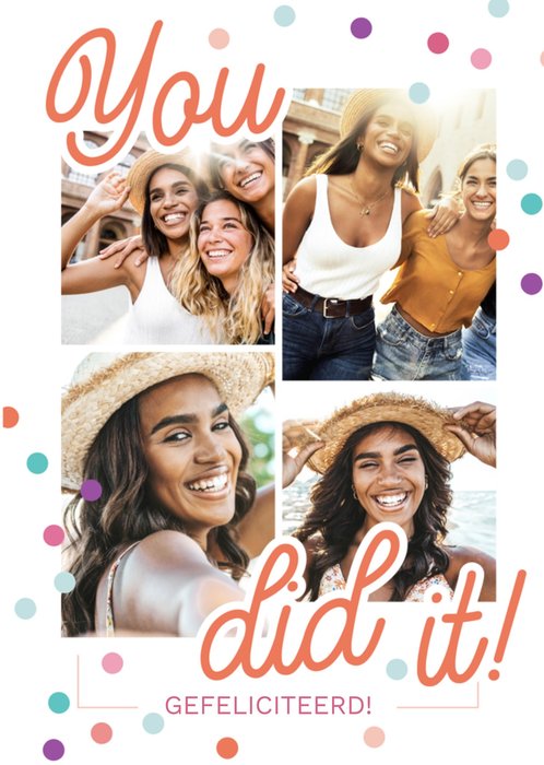 Kleurrijke geslaagdkaart met 4 fotos, aanpasbare tekst, en de tekst: 'You did it! Gefeliciteerd!' Verras iemand met deze vrolijke geslaagdkaart van Greetz.