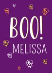 Wie ga jij laten schrikken met Halloween? Stuur dit grappige kaartje met rondzwevende doodshoofdjes erop met de tekst: BOO!. De naam op de kaart is aanpasbaar.