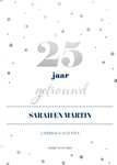 Witte uitnodiging uit de Greetz collectie. Op de voorkant staat een hip stippen patroon, en het jaartal is aanpasbaar.