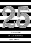 Op deze leuke jubileumkaart staat het getal 25 en de tekst: Gefeliciteerd 25 jaar getrouwd [namen]