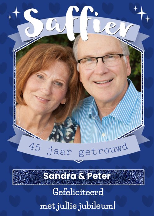 Leuke fotokaart met aanpasbare naam. Op de kaart staat: Saffier, 45 jaar getrouwd [namen] Gefeliciteerd met jullie jubileum!