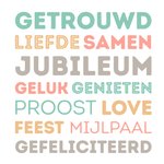 Op deze trouwkaart staat op een witte achtergrond in gekleurde letters teksten over 10 jaar getrouwd zijn.