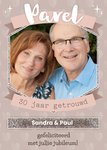Verras het bruidspaar met hun parelmoeren jubileum. De namen op de kaart zijn aanpasbaar. Ook kun je een foto toevoegen.