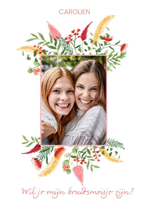 Leuke fotokaart met naam en de tekst: Wil je mijn bruidsmeisje zijn?