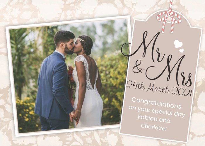 Mooie fotokaart met naam en datum voor het pas getrouwde stel