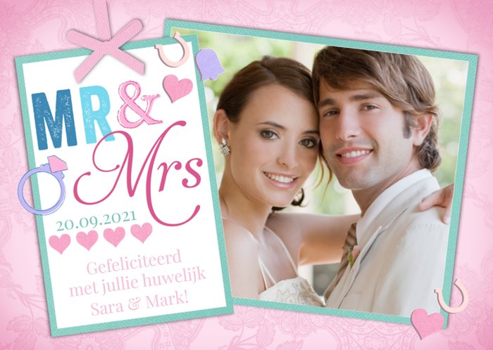 Fotokaart met naam en datum. Wenskaart van Greetz ontworpen door Greetz designers, volgens de laatste trends. Voeg je eigen foto('s), tekst, & versiering toe om de kaart extra persoonlijk te maken. Je kunt de kaart toevoegen aan je favorieten of tussentijds opslaan om deze later af te maken. Meer huwelijkskaarten zien? Check ze hier.