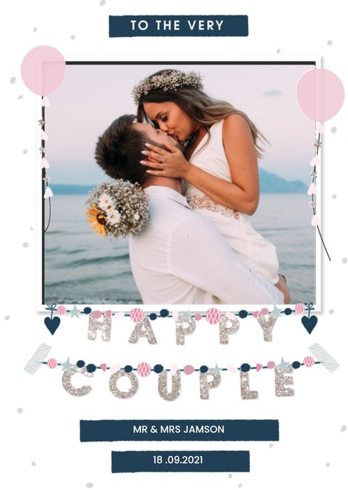 Vrolijke fotokaart met naam en de tekst: To the very happy couple mr & mrs [naam] [datum]